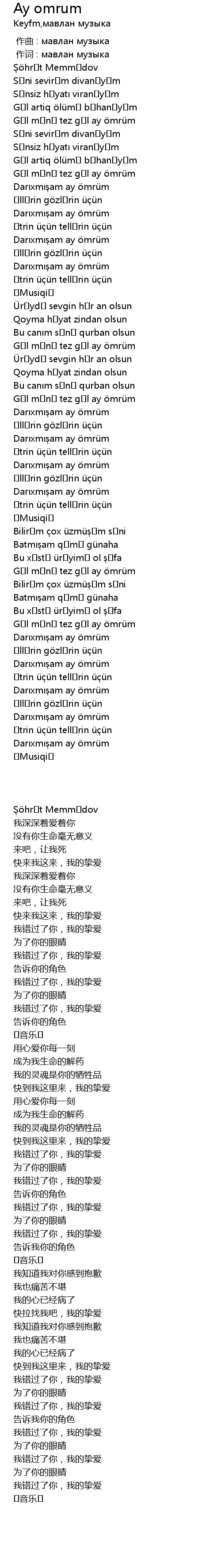 | [00:34.200] | Gəl mənə tez gəl ay ömrüm |