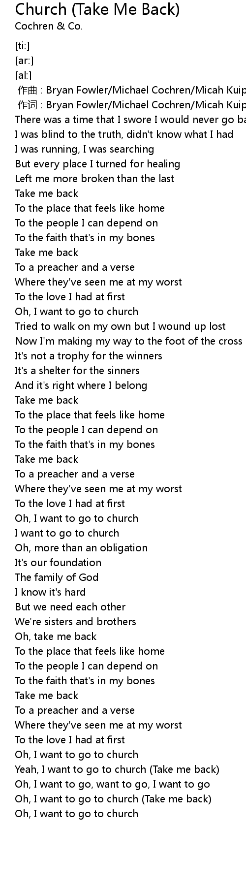 | [02:39.75] | Oh, I want to go to church Take me back |
