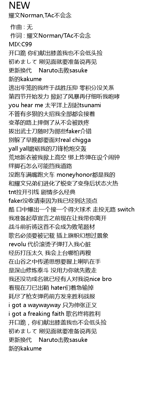 | [00:01.000] | 作词 : 耀文Norman/TAc不会念 |