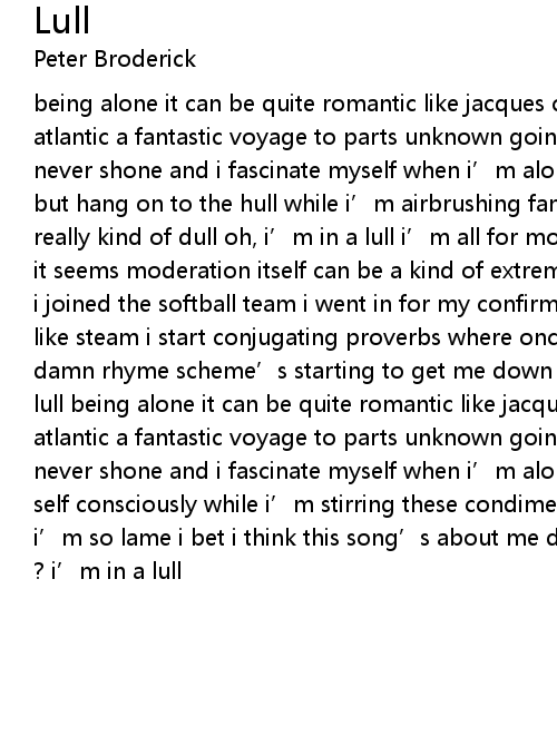 | being alone it can be quite romantic like jacques cousteau underneath the atlantic a fantastic voyage to parts unknown going to depths where the sun' s never shone and i fascinate myself when i' m alone so i go a little overboard but hang on to the hull while i' m airbrushing fantasy art on a life that' s really kind of dull oh, i' m in a lull i' m all for moderation but sometimes it seems moderation itself can be a kind of extreme so i joined the congregation i joined the softball team i went in for my confirmation where incense looks like steam i start conjugating proverbs where once there were nouns this whole damn rhyme scheme' s starting to get me down oh, i' m in a lull i' m in a lull being alone it can be quite romantic like jacques cousteau underneath the atlantic a fantastic voyage to parts unknown going to depths where the sun' s never shone and i fascinate myself when i' m alone i' m rambling on rather self consciously while i' m stirring these condiments into my tea and i think i' m so lame i bet i think this song' s about me don' t i don' t i don' t i ? i' m in a lull |