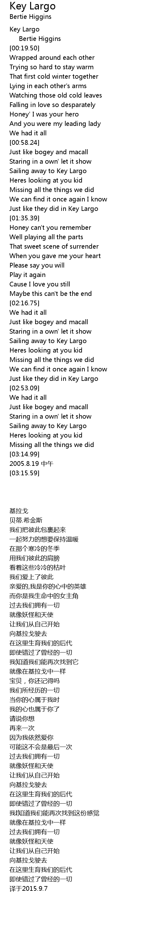| [02:31.91] | Sailing away to Key Largo |