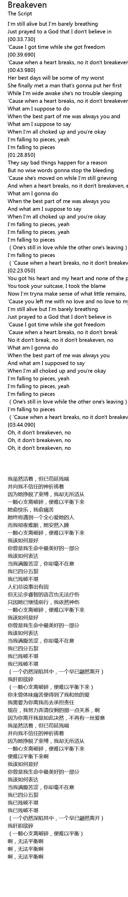 | [02:49.010] | I' m still alive but I' m barely breathing |