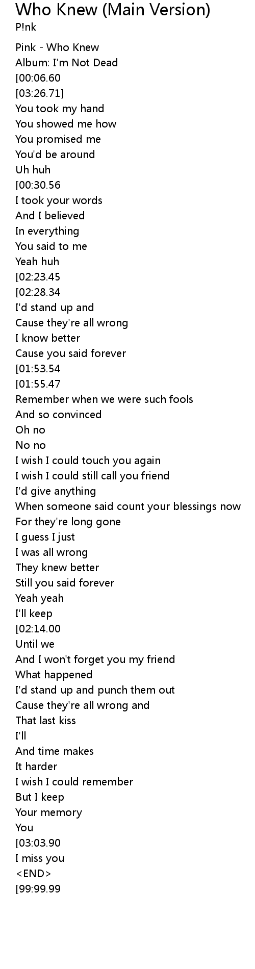 | [00:57.56][01:55.47][03:00.44][03:07.25][03:14.08][03:20.87] | Who knew |
