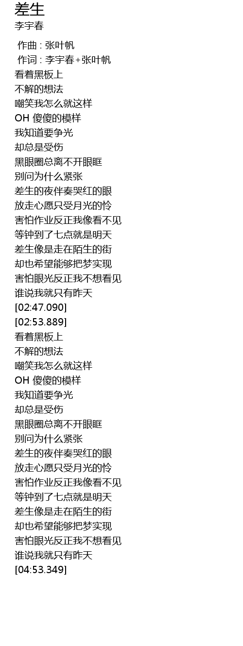 | [02:20.990] | 差生像是走在陌生的街 |