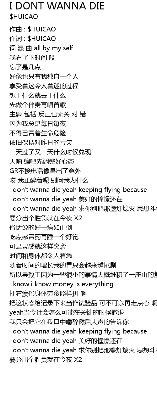 | i don' t wanna die yeah qiú nǐ bié bǎ nà zhǎn dēng xī miè sī xiǎng dòu zhēng yuè lái yuè jī liè yào fèn chū gè shèng fù jiù zài jīn yè X2 | |