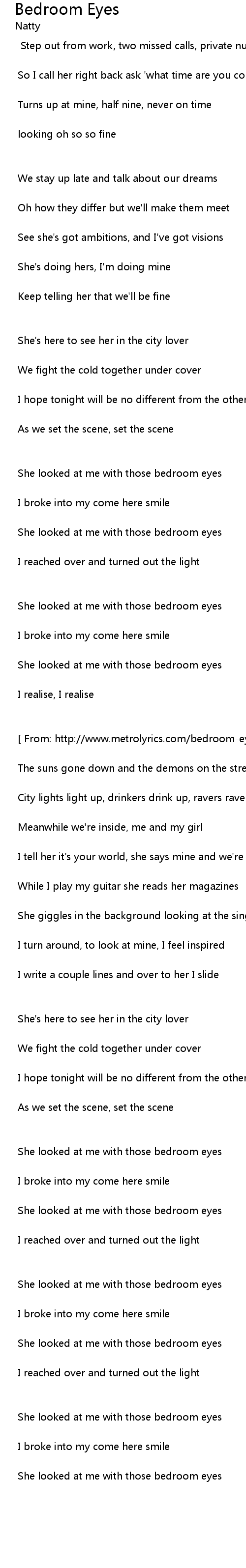 [ From: http://www.metrolyrics.com/bedroom-eyes-lyrics-natty.html ] |