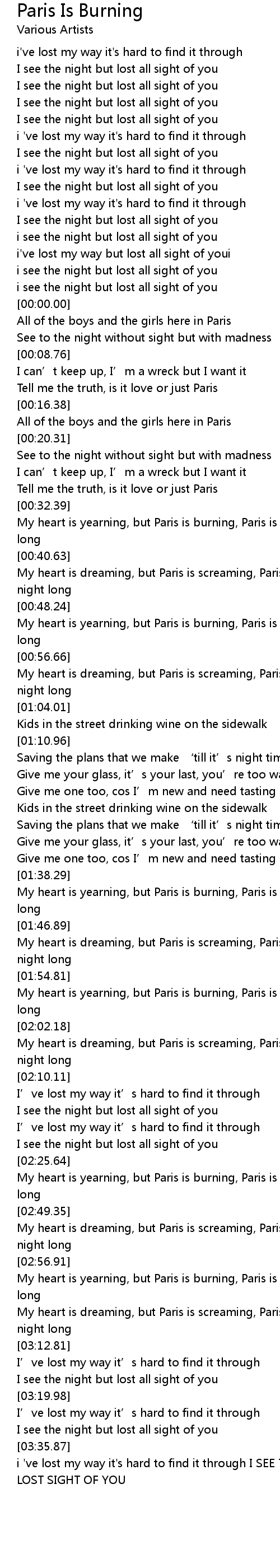 | [01:55.69] | My heart is yearning, but Paris is burning, Paris is burning all night long |