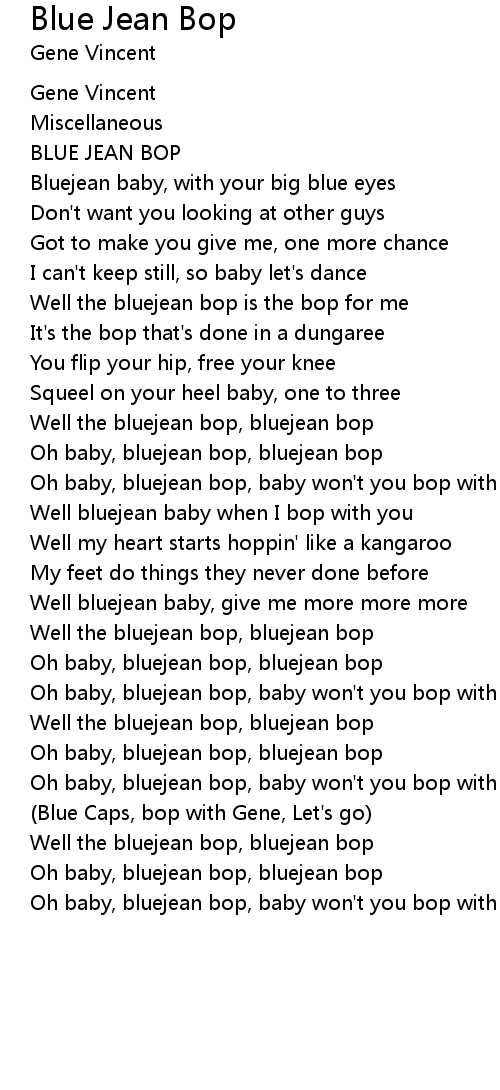 Oh baby, bluejean bop, baby won't you bop with Gene. (Rock again Blue Caps, Go) |