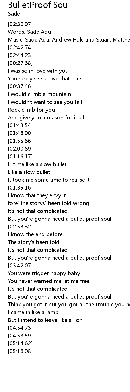 | [03:44.97][02:32.07][00:00.00] | Sade Bullet Proof Soul |