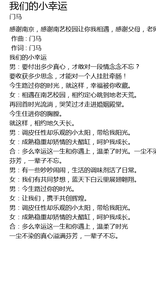 | [01:07.340] | 女:相遇在南艺校园,相约定心跳到地老天荒。 |