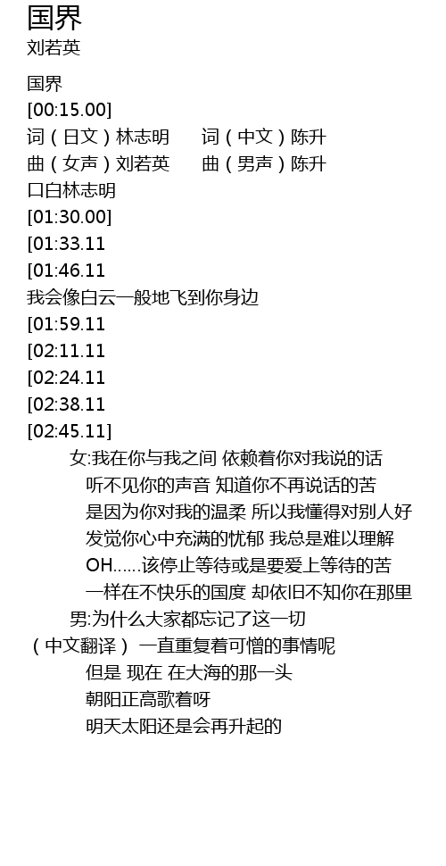 | [00:45.00] | 曲(女声)刘若英 曲(男声)陈升 口白林志明 |