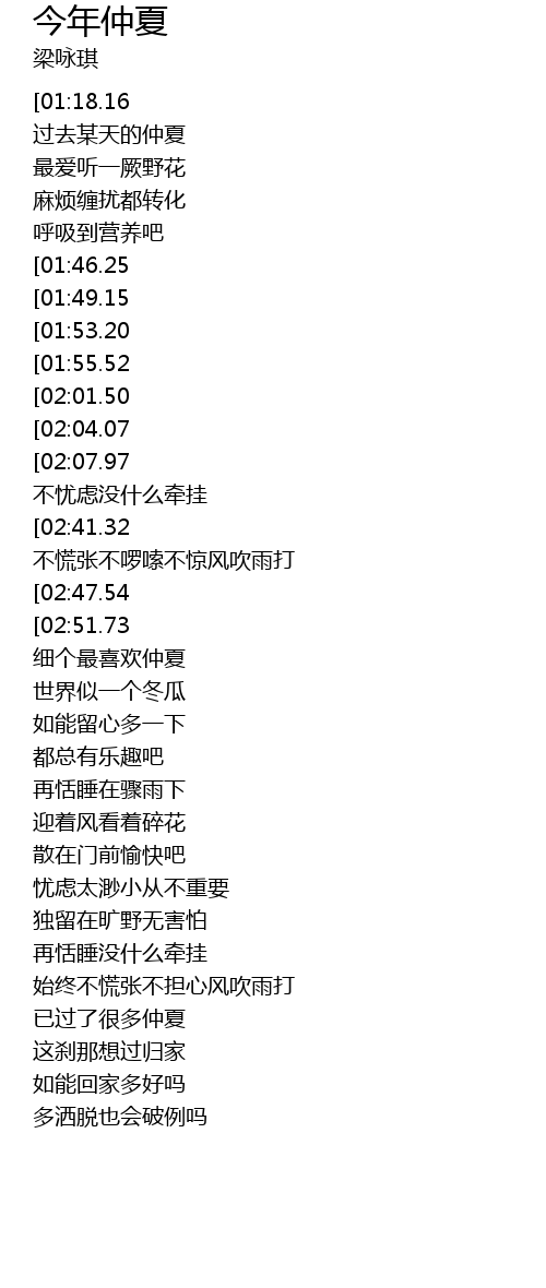 | [00:15.00][01:18.16][03:12.15] | 梁咏琪-今年仲夏(粤) |