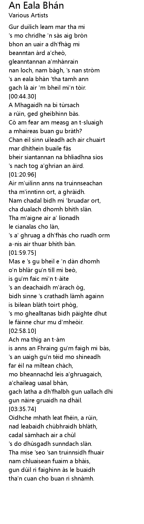 | [00:35.31] | ' s an eala bhà n ' tha tamh ann |