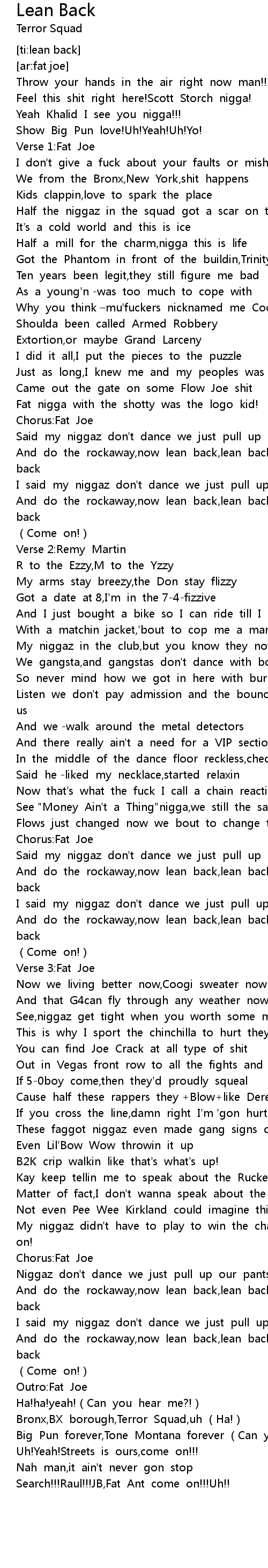 | [02:23.321] | And do the rockaway, now lean back, lean back, lean back, lean back |