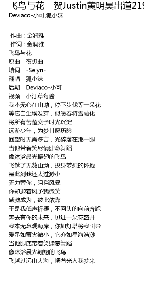| Song | 飞鸟与花—贺Justin黄明昊出道219天(翻自 金润雅) |