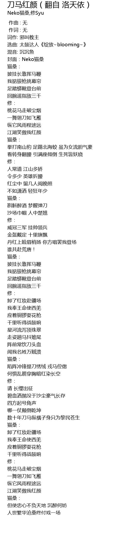 | [00:59.908] | 披挂长靠挥马鞭 |