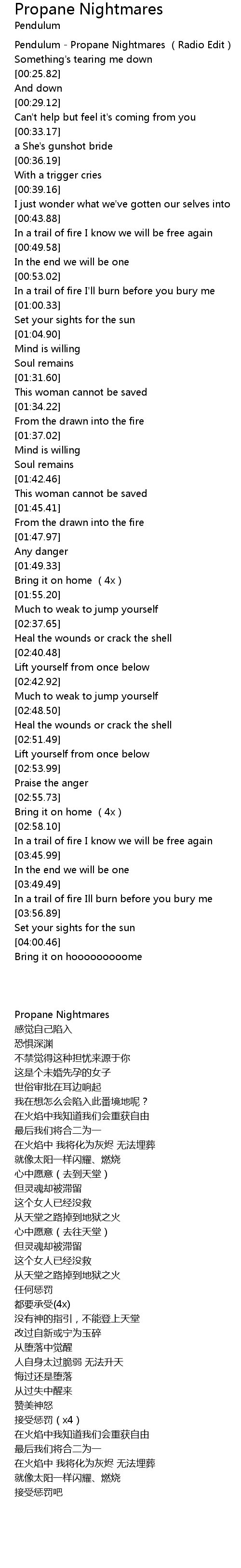 | [00:01.71] | Pendulum Propane Nightmares Radio Edit |