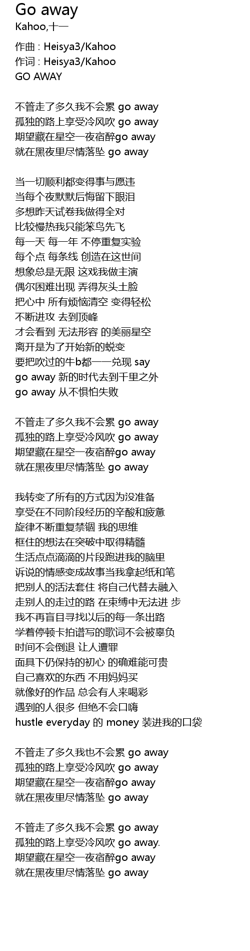 | bù guǎn zǒu le duō jiǔ wǒ bú huì lèi go away | |