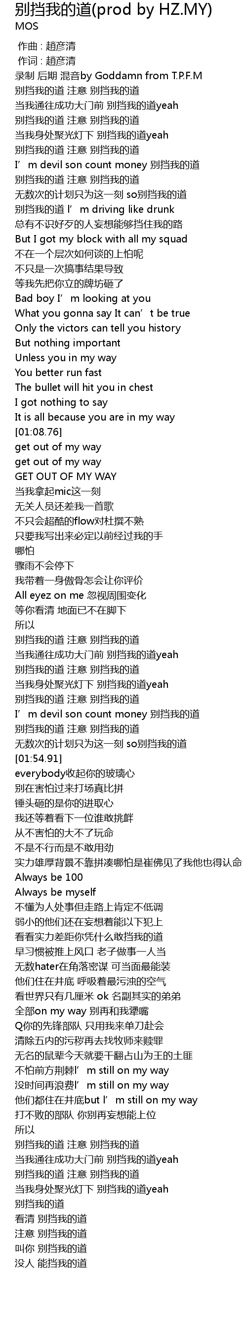 | [01:32.66] | 别挡我的道 注意 别挡我的道 |