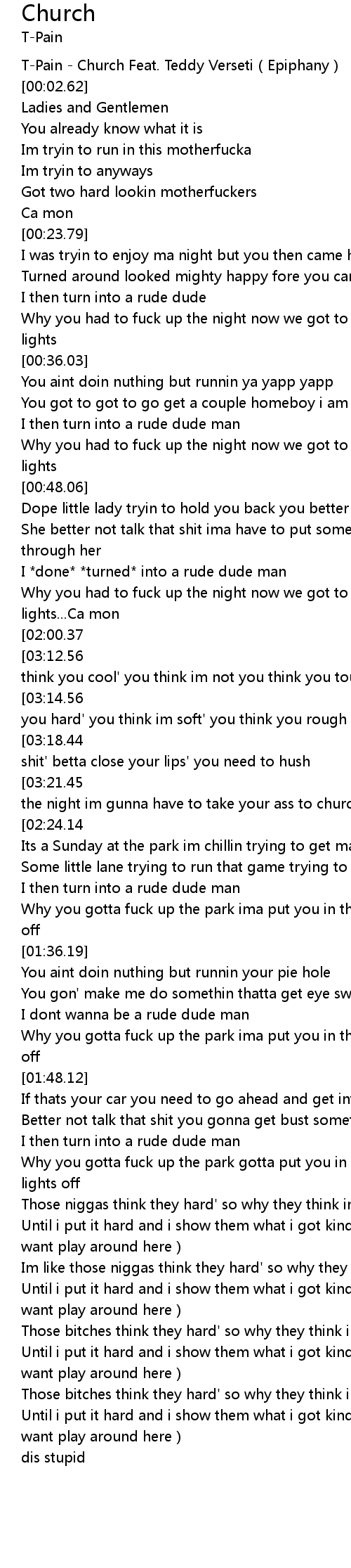 | [00:00.00] | T-Pain - Church Feat. Teddy Verseti(Epiphany) |