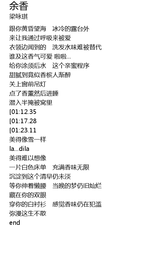 | [02:08.00][01:23.11] | 香气仿如乐章 可给我欣赏 |