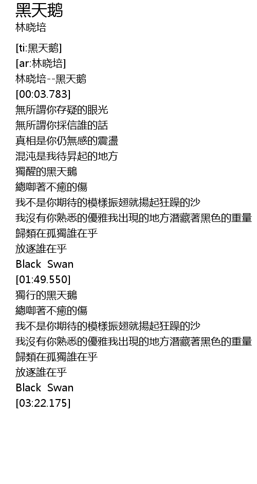 | [00:01.392] | 林晓培--黑天鹅 |