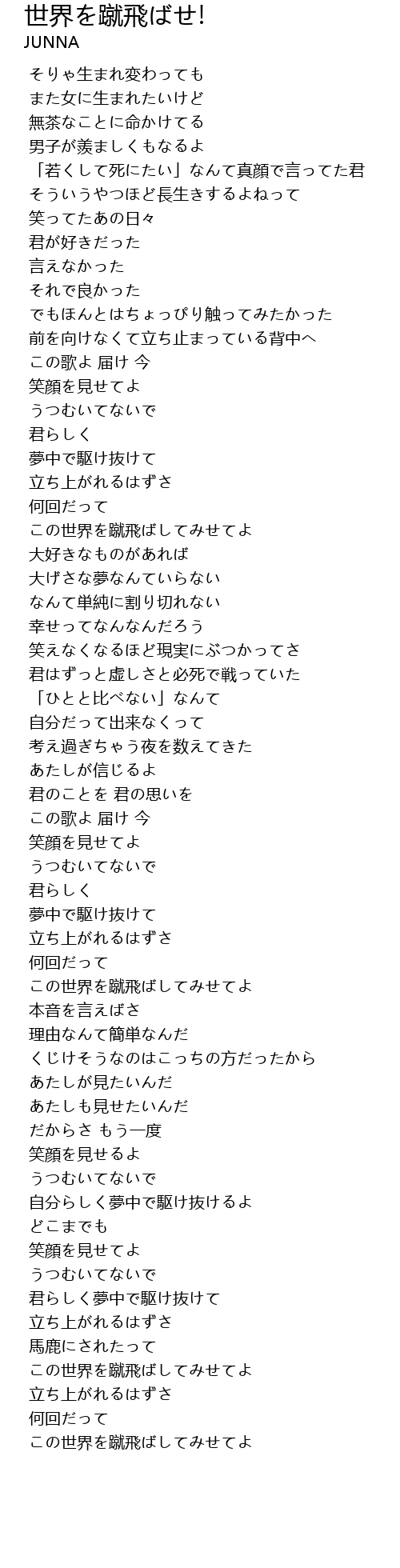 | [01:18.304] | この世界を蹴飛ばしてみせてよ |