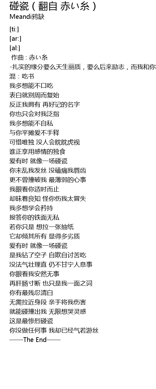 | [00:00.00] | -扎实的缘分要么天生丽质,要么后来励志,而我和你之间,始终只是一厢情愿的碰瓷。 |