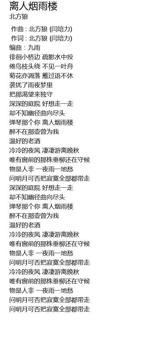 | [00:01.000] | 作词 : 北方狼 (闫培力) |