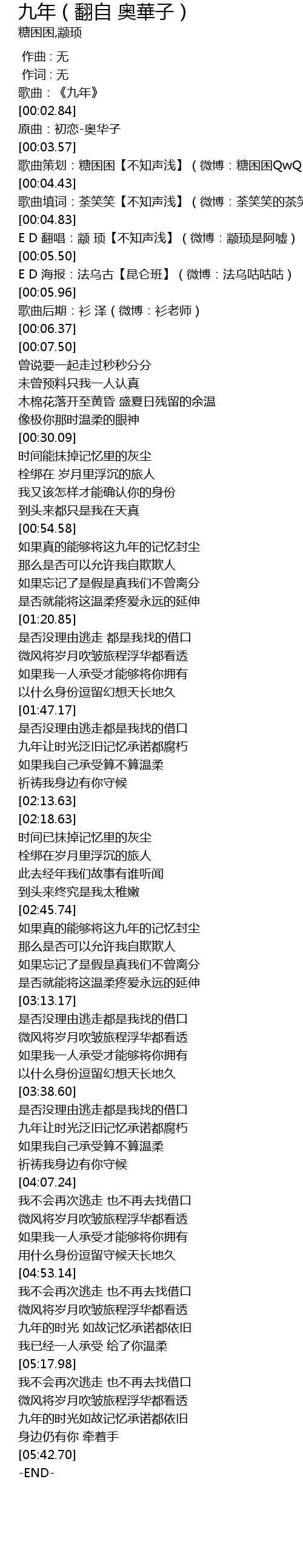 | [00:02.12] | gē qǔ: jiǔ nián |