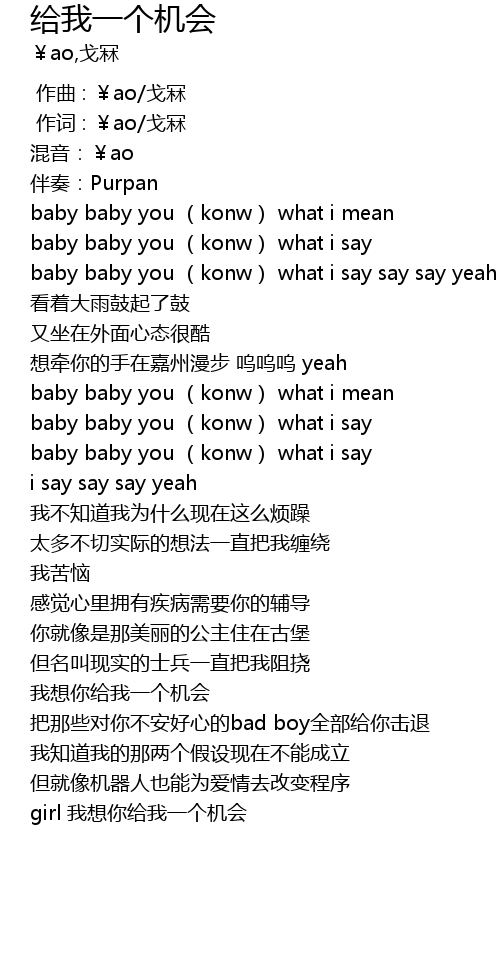 | [01:00.691] | girl wǒ xiǎng nǐ gěi wǒ yí gè jī huì |