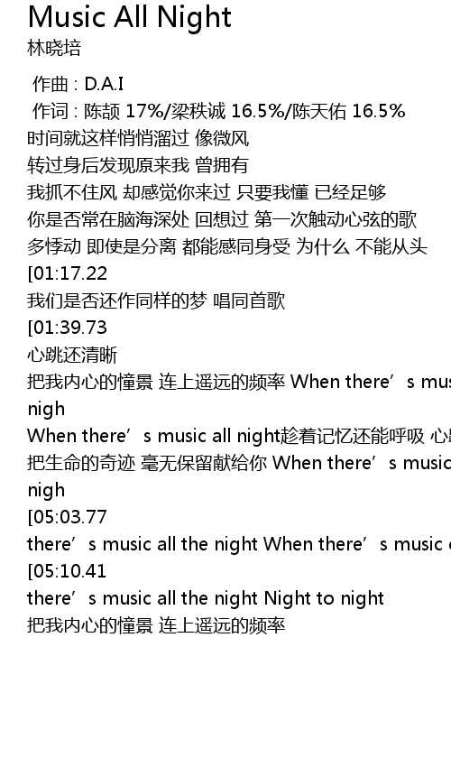 | [02:56.78][01:39.73] | When there’s music all night趁着记忆还能呼吸 心跳还清晰 |