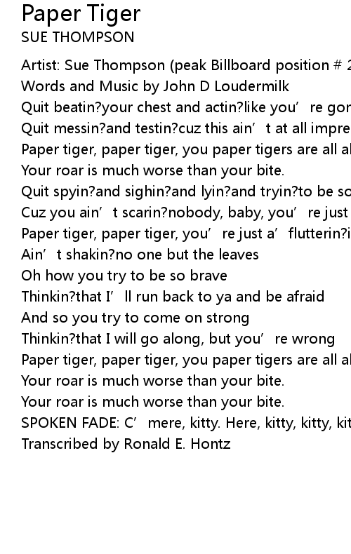| Paper tiger, paper tiger, you' re just a' flutterin? in the tree | |