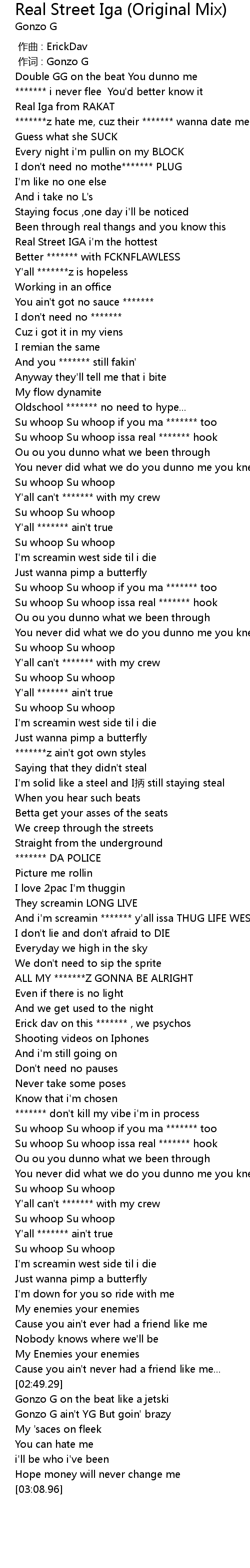 | [02:21.81] | Su whoop Su whoop issa real ******* hook |