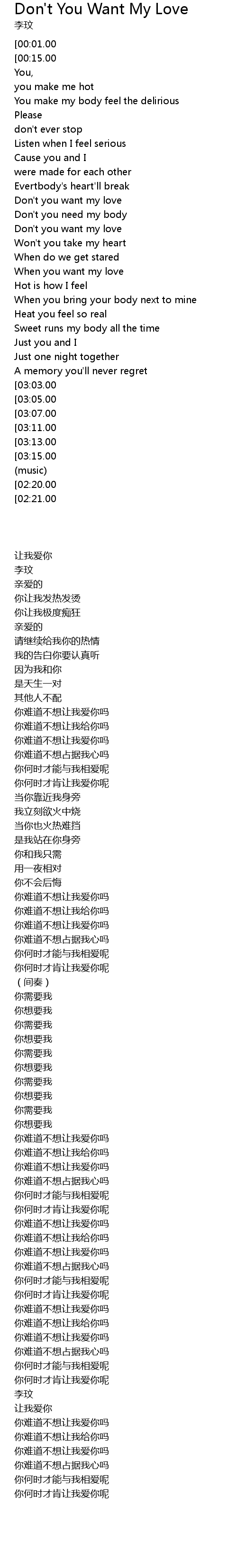 | [03:31.00][00:01.00] | Don't You Want My Love |