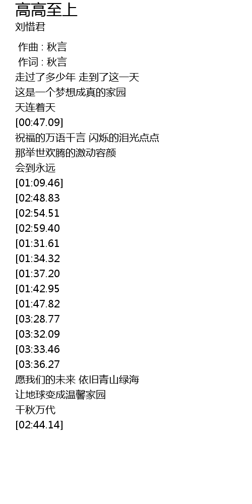 | [03:51.01][02:59.40][01:25.17] | ài shǐ zhōng gāo gāo zhì shàng gāo gāo zhì shàng |