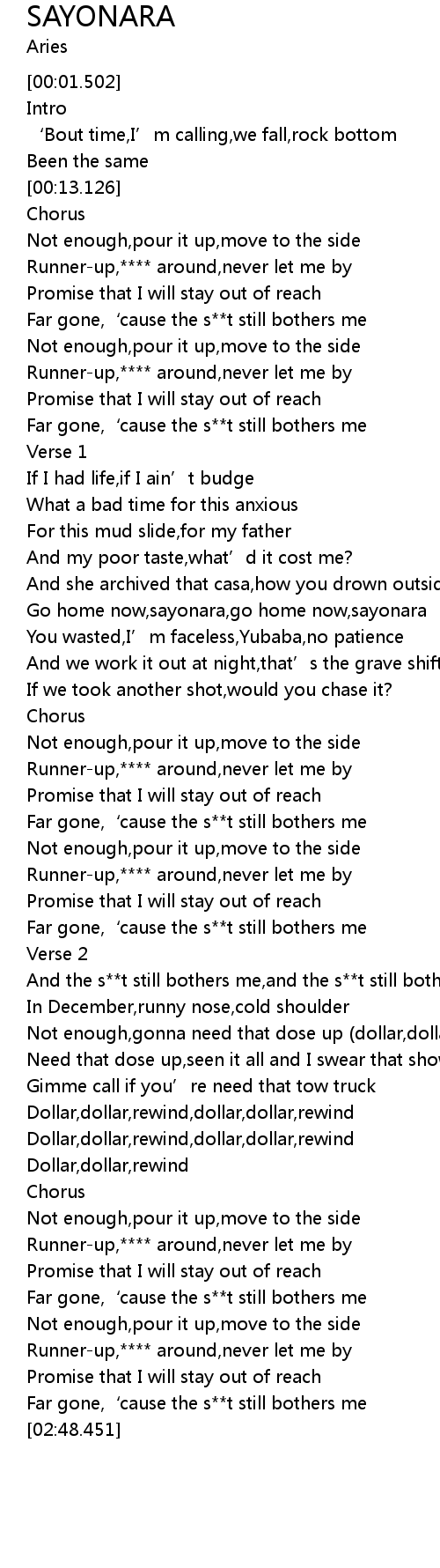 | [01:01.166] | Go home now, sayonara, go home now, sayonara |