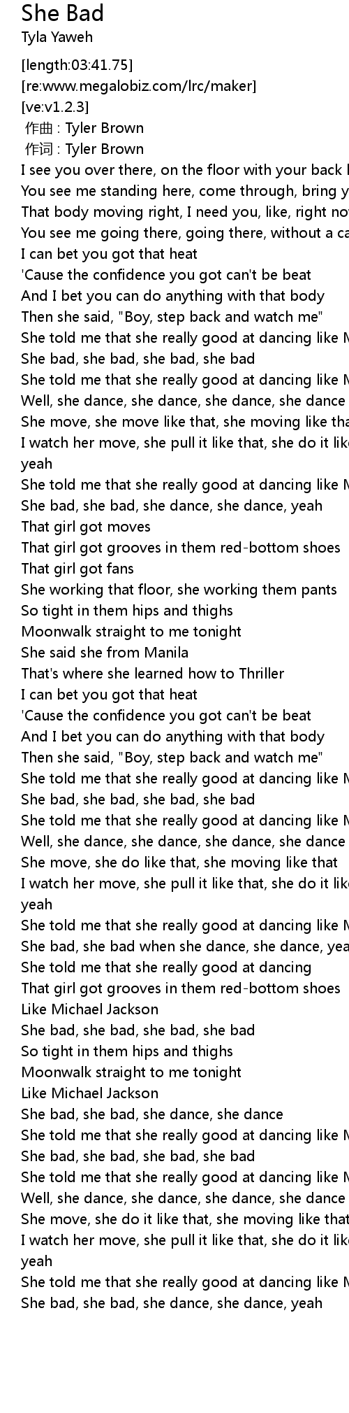 | [03:00.42] | She bad, she bad, she dance, she dance |