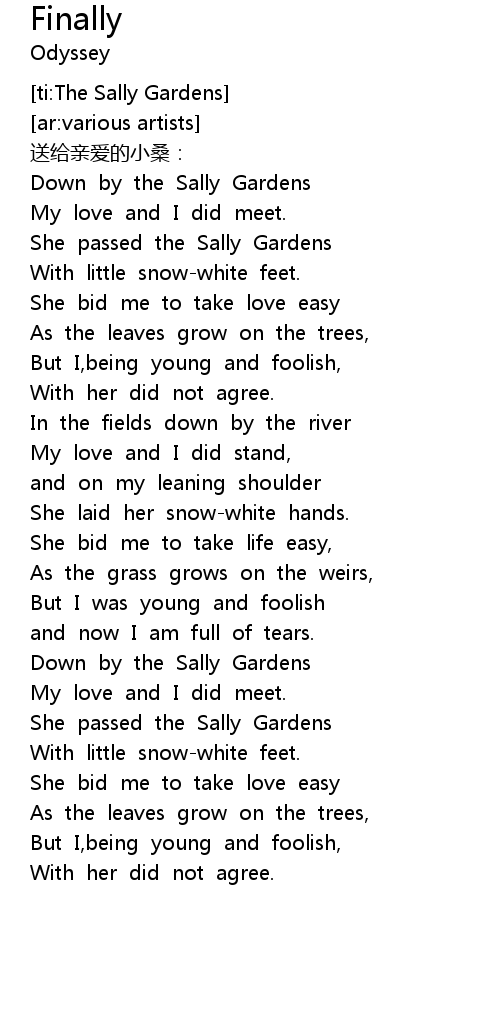 | [00:27.13] | She passed the Sally Gardens |