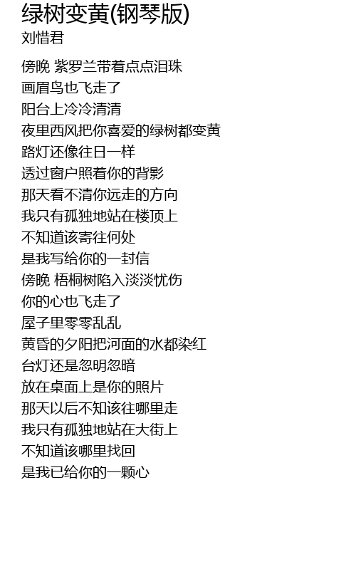 | [00:33.957] | 夜里西风把你喜爱的绿树都变黄 |