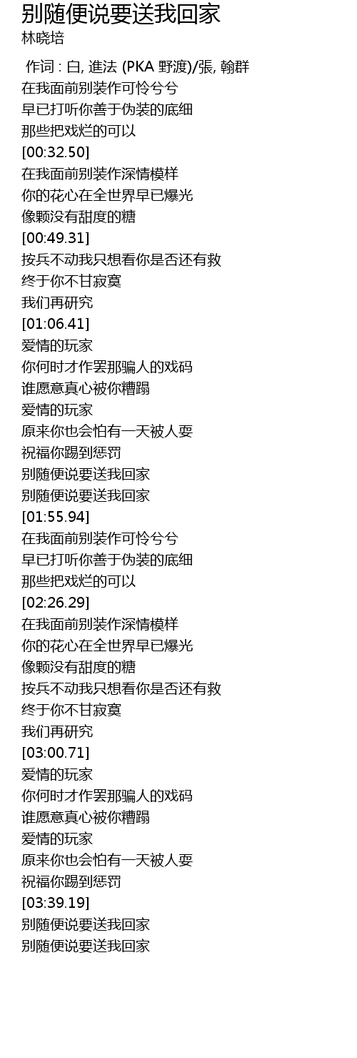 | [03:48.94] | bié suí biàn shuō yào sòng wǒ huí jiā |