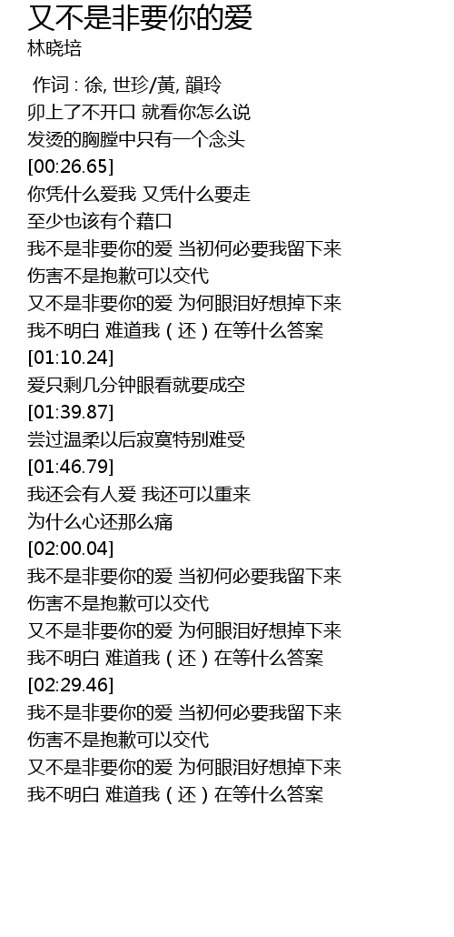 | [02:34.95] | 我不是非要你的爱 当初何必要我留下来 |