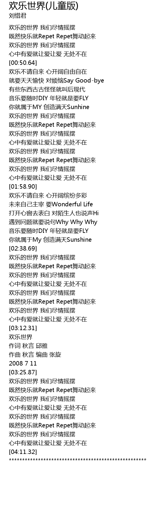 | [00:41.70] | huān lè de shì jiè wǒ men jìn qíng yáo bǎi |
