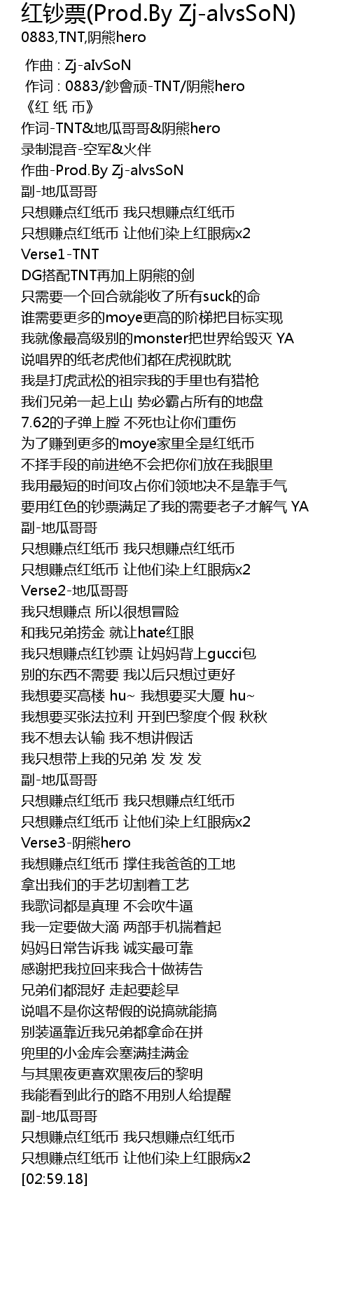 | [01:53.46] | 只想赚点红纸币 让他们染上红眼病x2 |