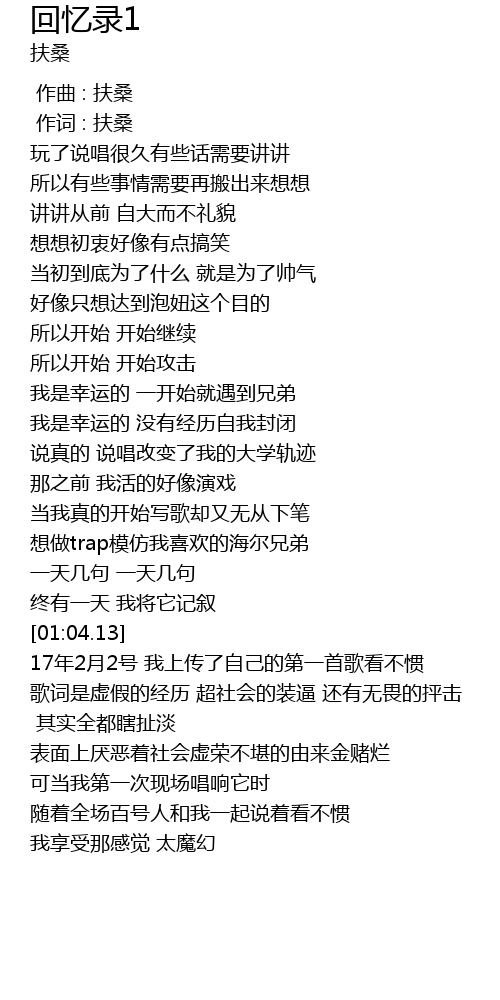 | [01:05.57] | 17年2月2号 我上传了自己的第一首歌看不惯 |
