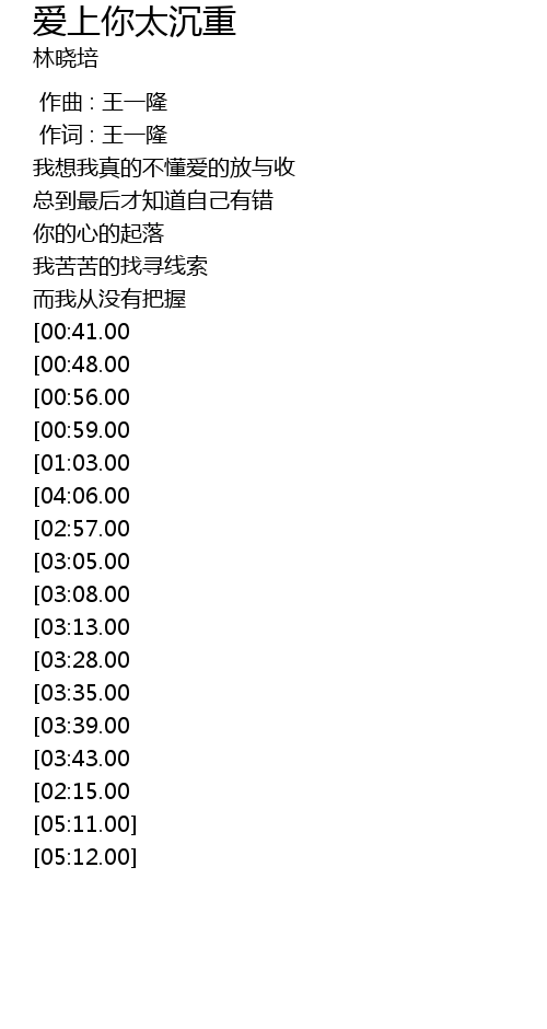 | [04:36.00][04:06.00][03:20.00][02:50.00][01:41.00][01:11.00] | 爱上你是折磨太沈重 |