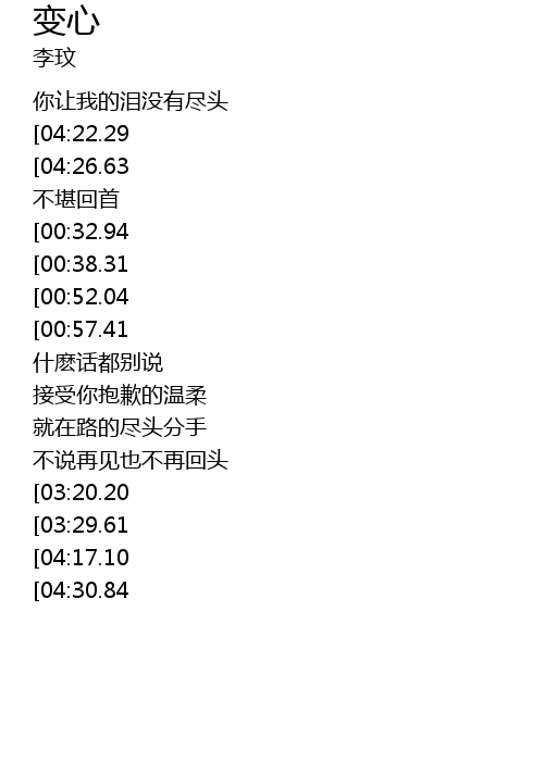 | [04:55.47][04:17.10][03:38.87][01:48.06] | 你让我的泪没有尽头 |