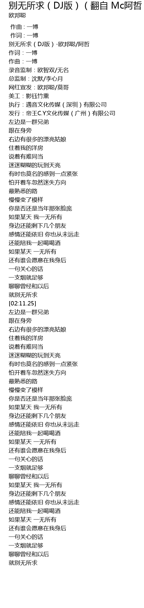 | [00:00.61] | 别无所求(DJ版)-欧邦聪/阿哲 |