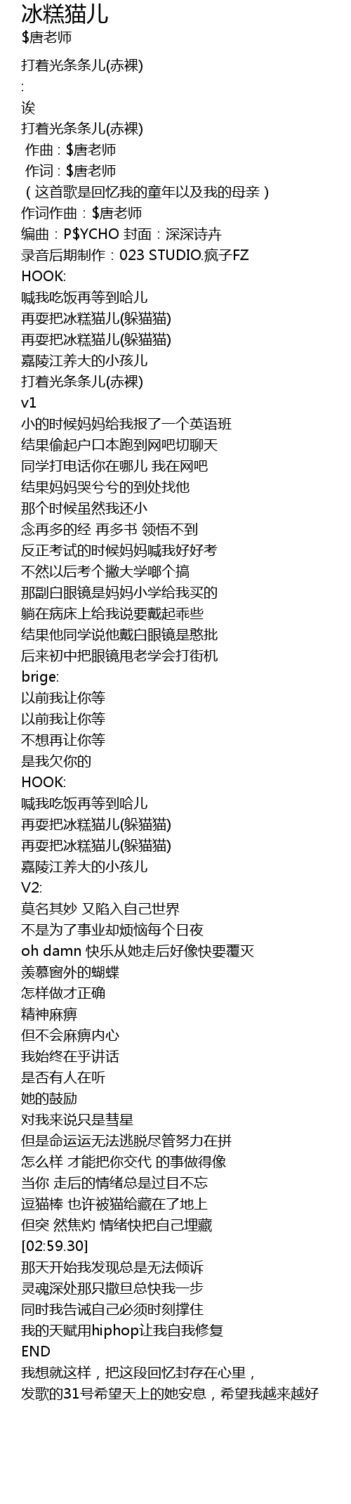 | [01:59.08] | 再耍把冰糕猫儿(躲猫猫) |