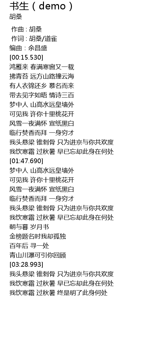 | [00:01.000] | 作词 : 胡桑/道雀 |